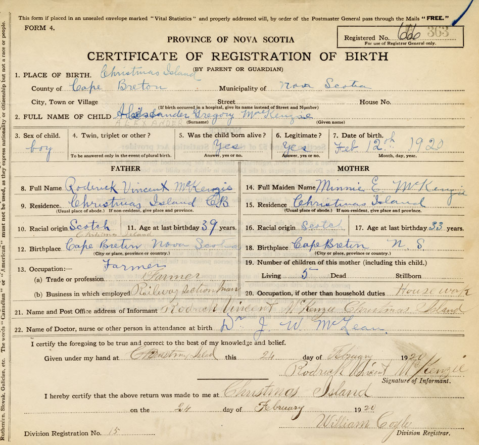 21. Name and Post Office address of Informant Roderick Vincent McKenzie Christmas Island