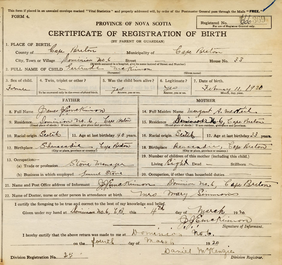 21. Name and Post Office address of Informant J.J.E. McKinnon Dominion No.6, Cape Breton