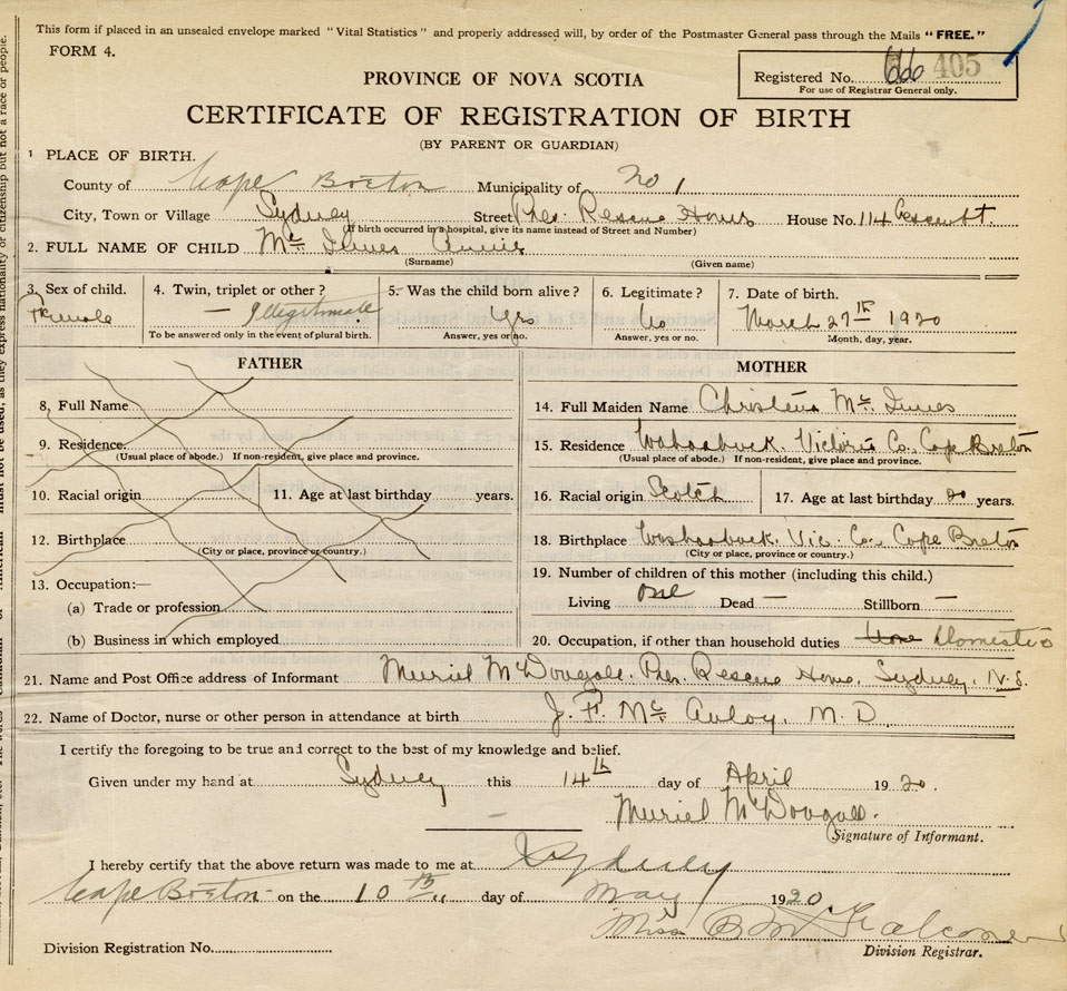 21. Name and Post Office address of Informant Muriel McDougall Pres . Rescue Home Sydney N.S.