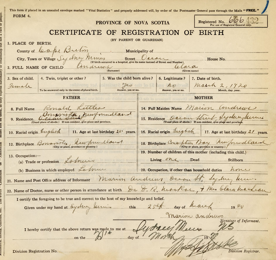 21. Name and Post Office address of Informant Marion Andrews Ocean St., Sydney Mines
