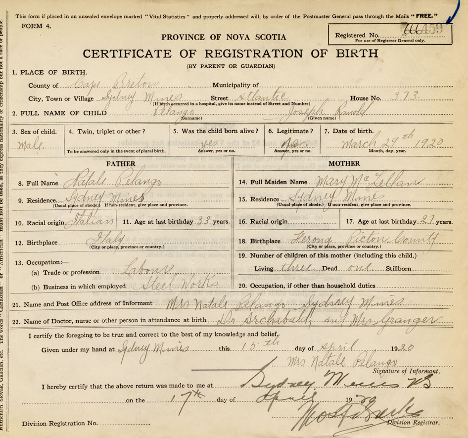 21. Name and Post Office address of Informant Mrs. Natale Pelango Sydney Mines