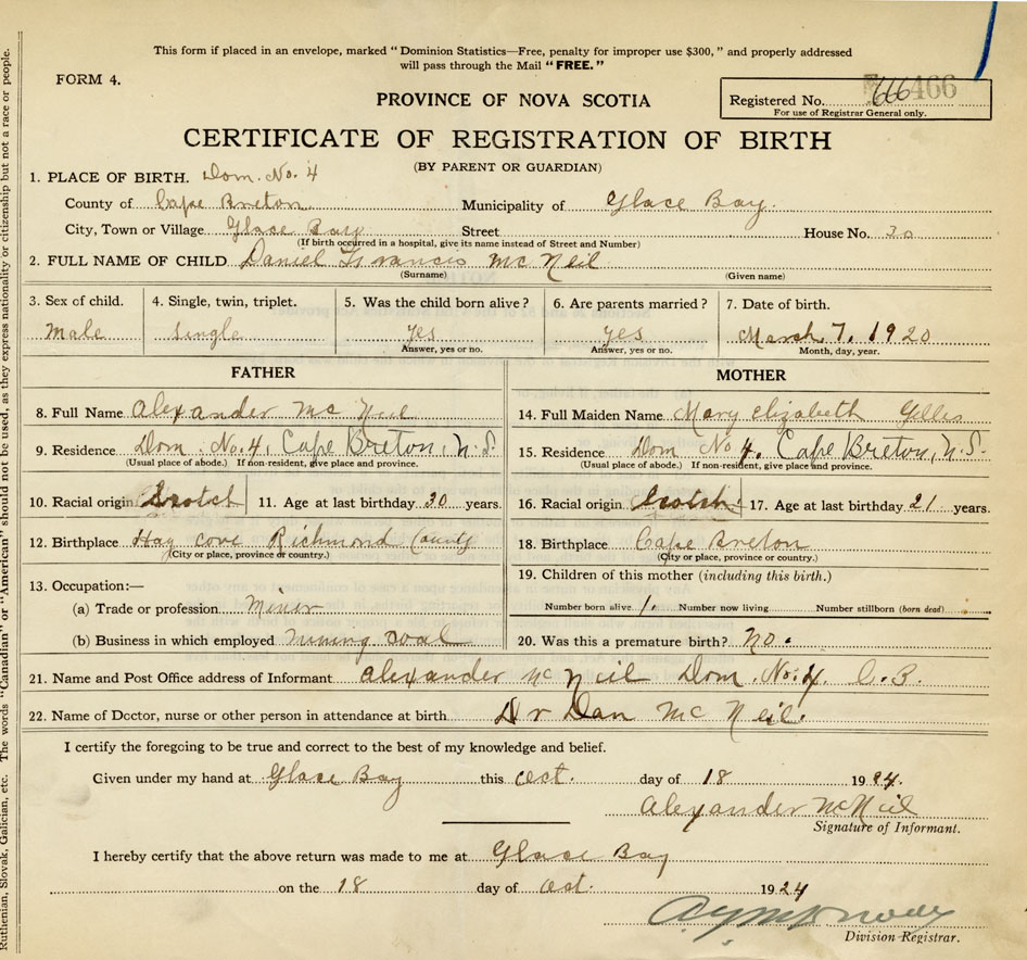 21. Name and Post Office address of Informant Alexander McNeil Dom. No.4