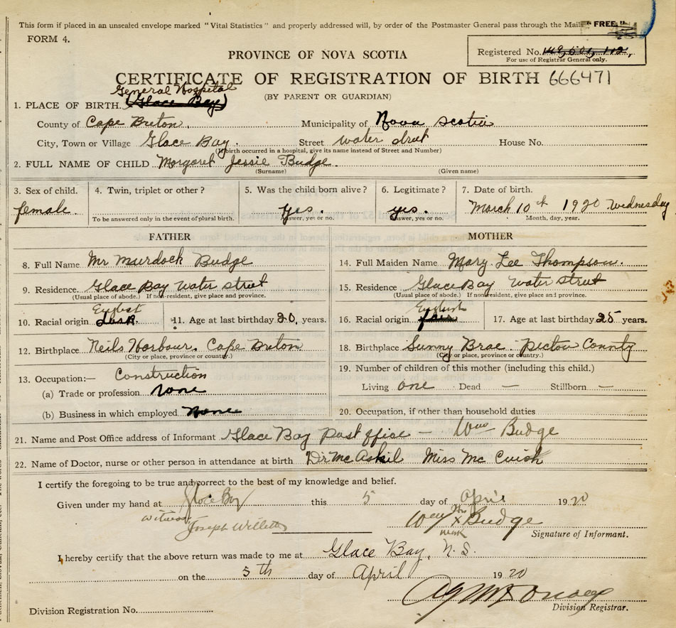 21. Name and Post Office address of Informant Wm Budge Glace Bay Post Office