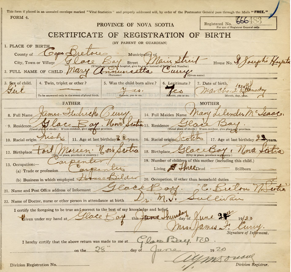 21. Name and Post Office address of Informant Glace Bay, C. Breton, N. Scotia