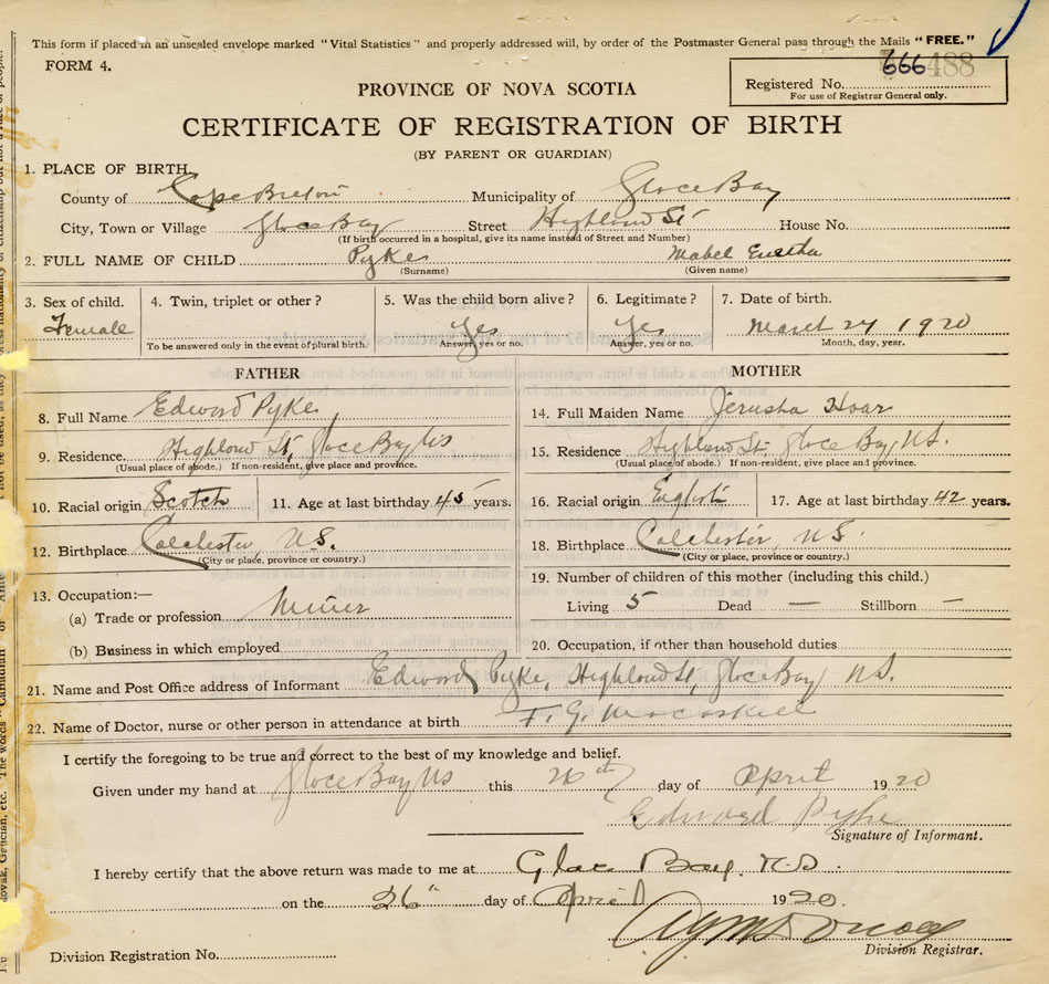 21. Name and Post Office address of Informant Edward Pyke Highland St., Glace Bay
