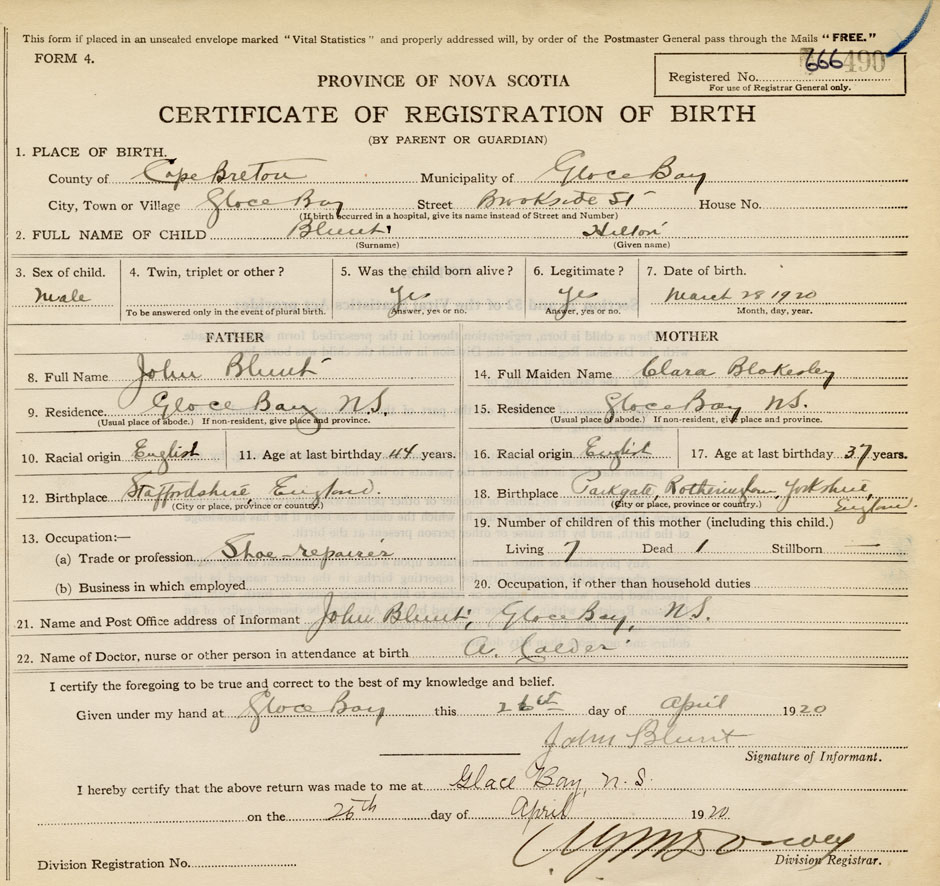 21. Name and Post Office address of Informant John Blunt Glace Bay