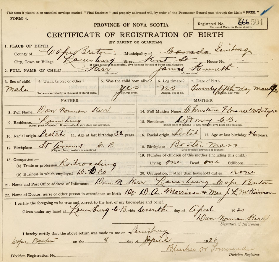 21. Name and Post Office address of Informant Dan N. Kerr Louisburg, Cape Breton