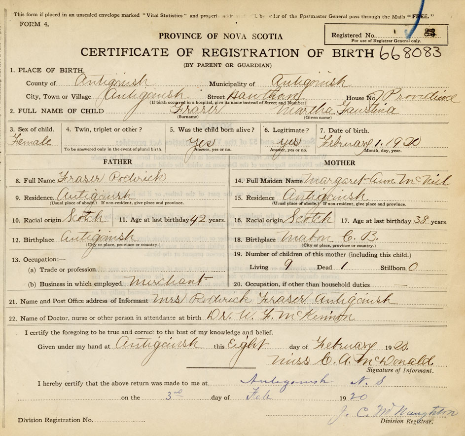 21. Name and Post Office address of Informant Mrs. Roderick Fraser Antigonish