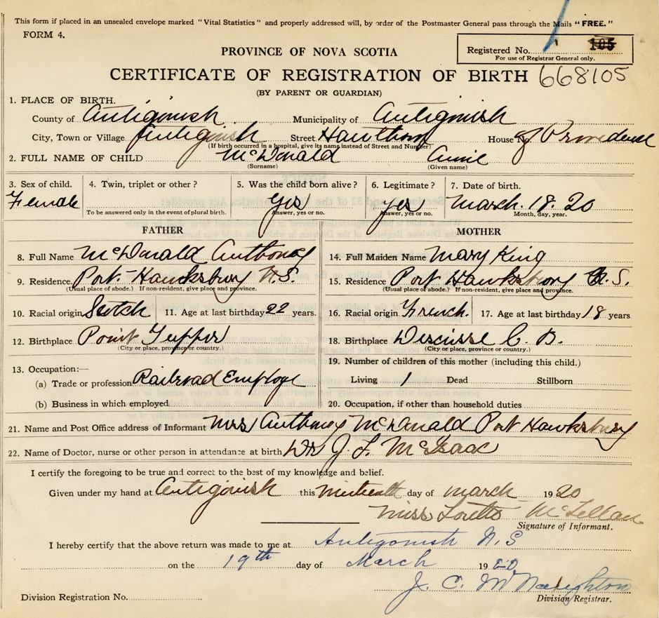 21. Name and Post Office address of Informant Mrs. Anthony McDonald Port Hawkesbury
