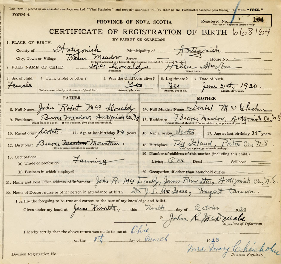 22. Name of Doctor, nurse or other person in attendance at birth Dr. J.L. MacIsaac, Margaret Cameron