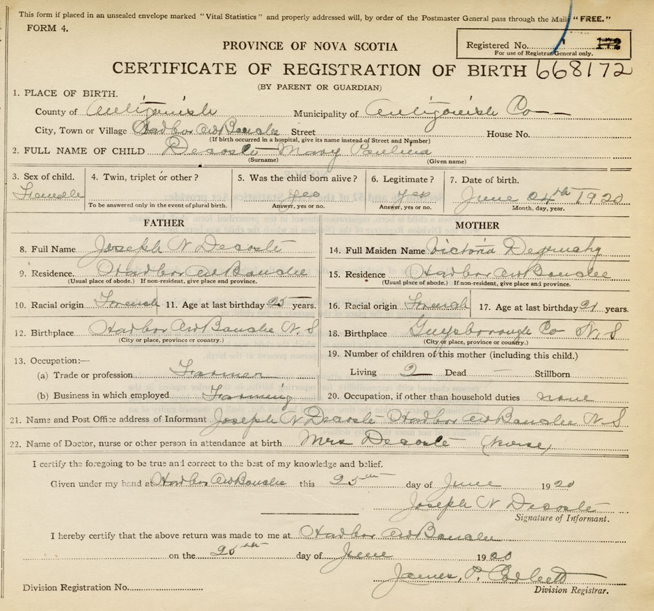 22. Name of Doctor, nurse or other person in attendance at birth Mrs. Decoste (Nurse)
