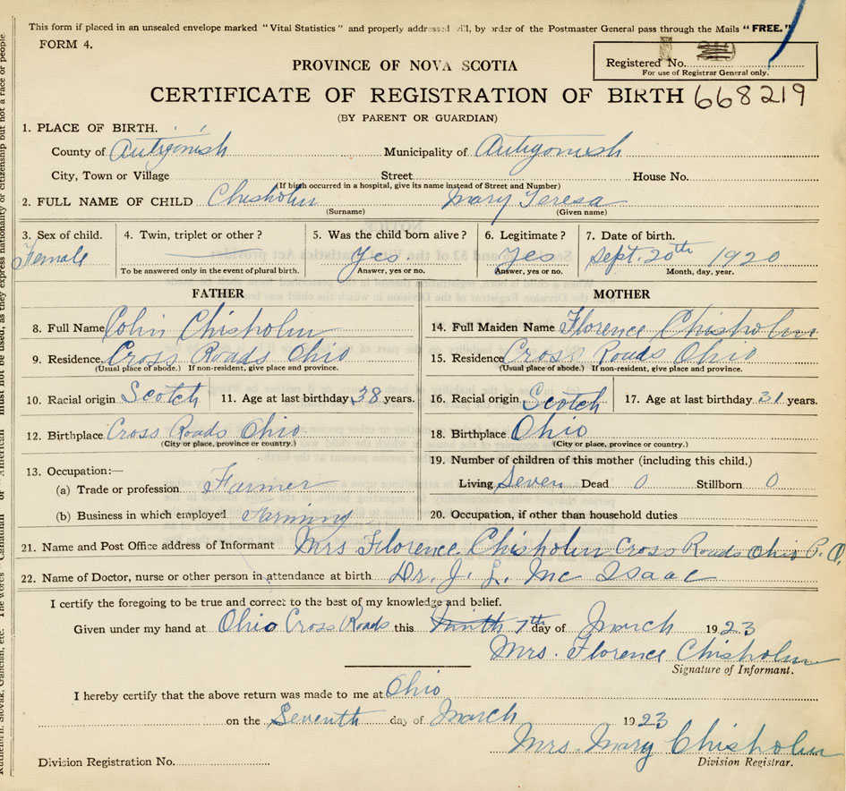 22. Name of Doctor, nurse or other person in attendance at birth Dr. J.L. McIsaac