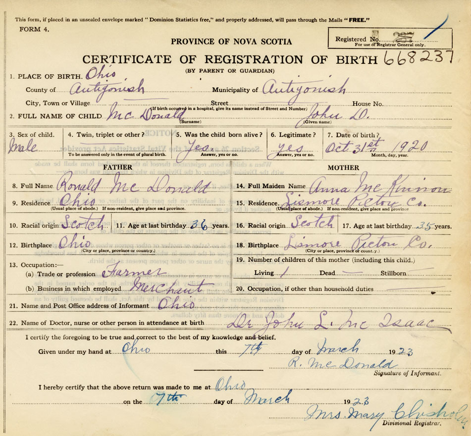 22. Name of Doctor, nurse or other person in attendance at birth Dr. John L. McIsaac