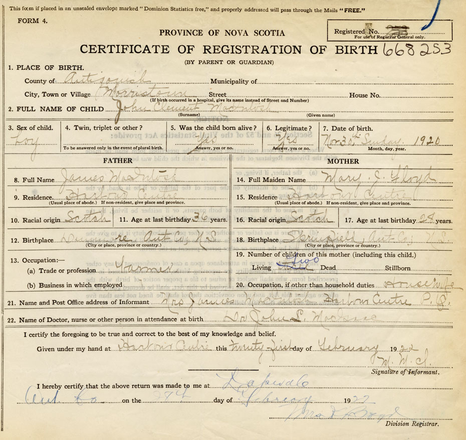 22. Name of Doctor, nurse or other person in attendance at birth Dr. John L. MacIsaac