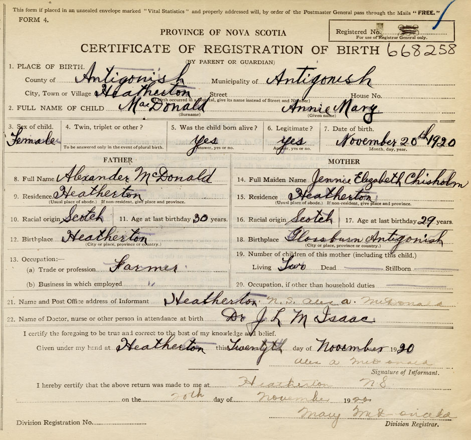 22. Name of Doctor, nurse or other person in attendance at birth Dr. J.L. McIsaac
