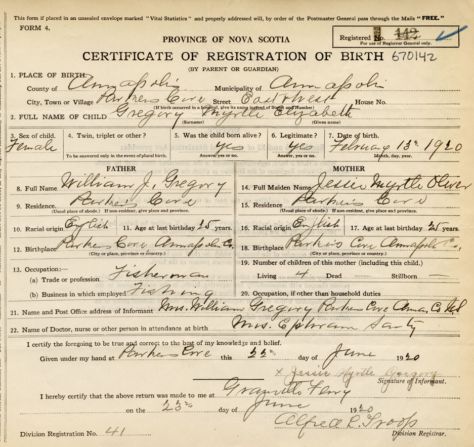 21. Name and Post Office address of Informant Mrs. William Gregory Parkers Cove, Anna. Co. N.S.