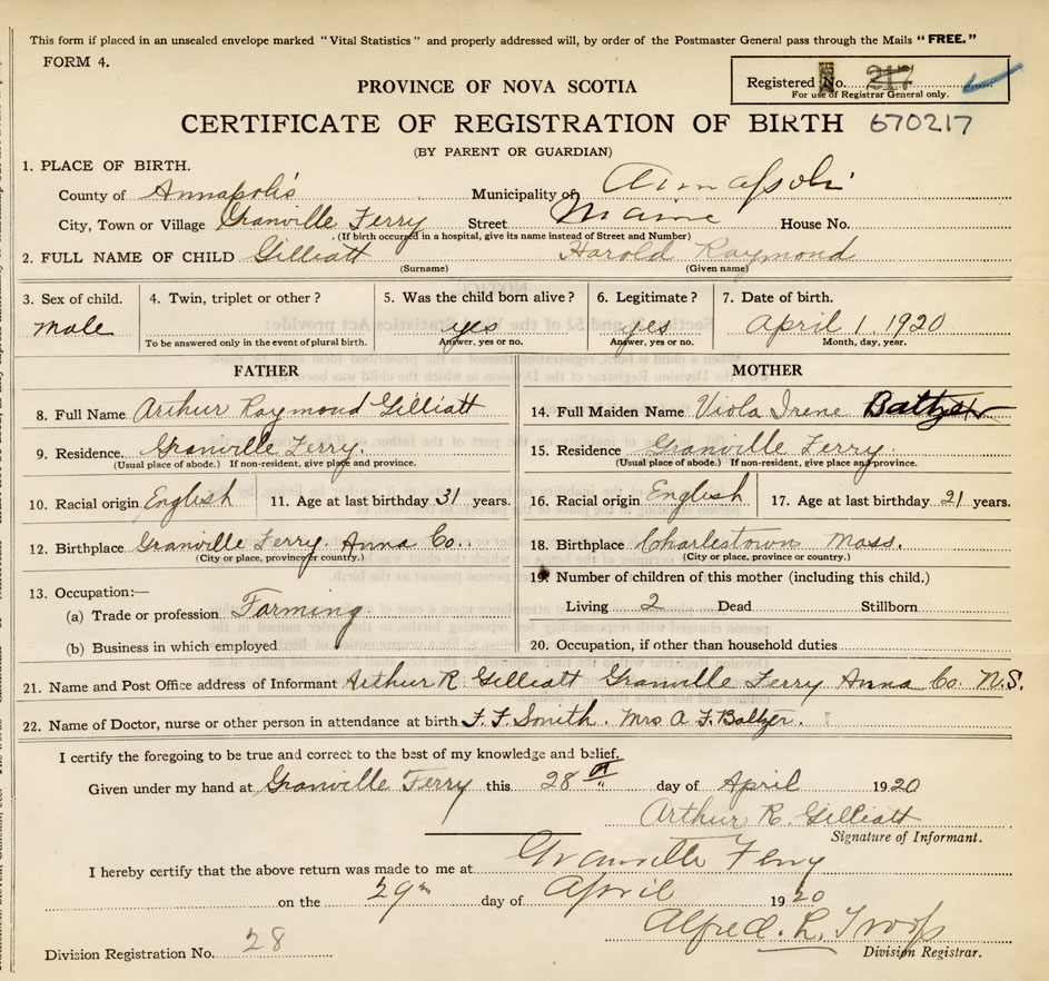 21. Name and Post Office address of Informant Arthur R Gilliatt Granville Ferry, Annapolis County