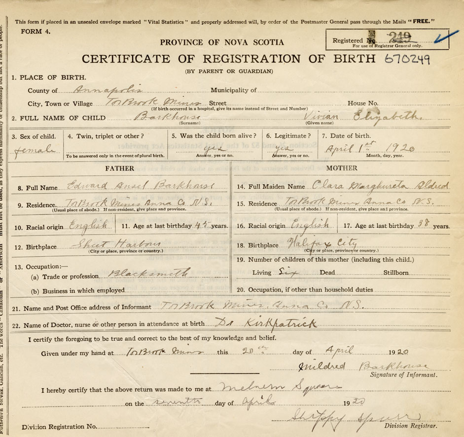 21. Name and Post Office address of Informant Mildred Barkhouse Torbrook Mines, Annapolis County