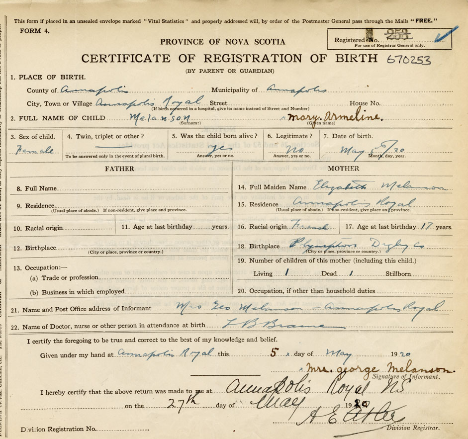 21. Name and Post Office address of Informant Mrs Geo Melanson Annapolis Royal