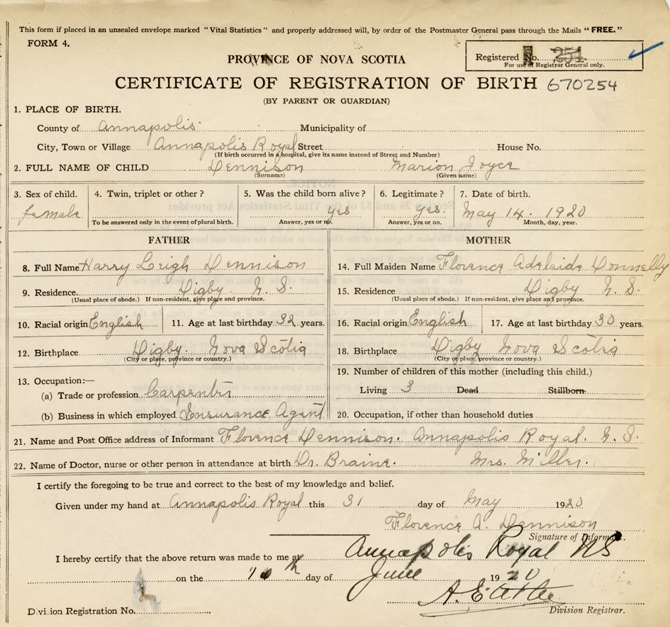 21. Name and Post Office address of Informant Florence Dennison Annapolis Royal