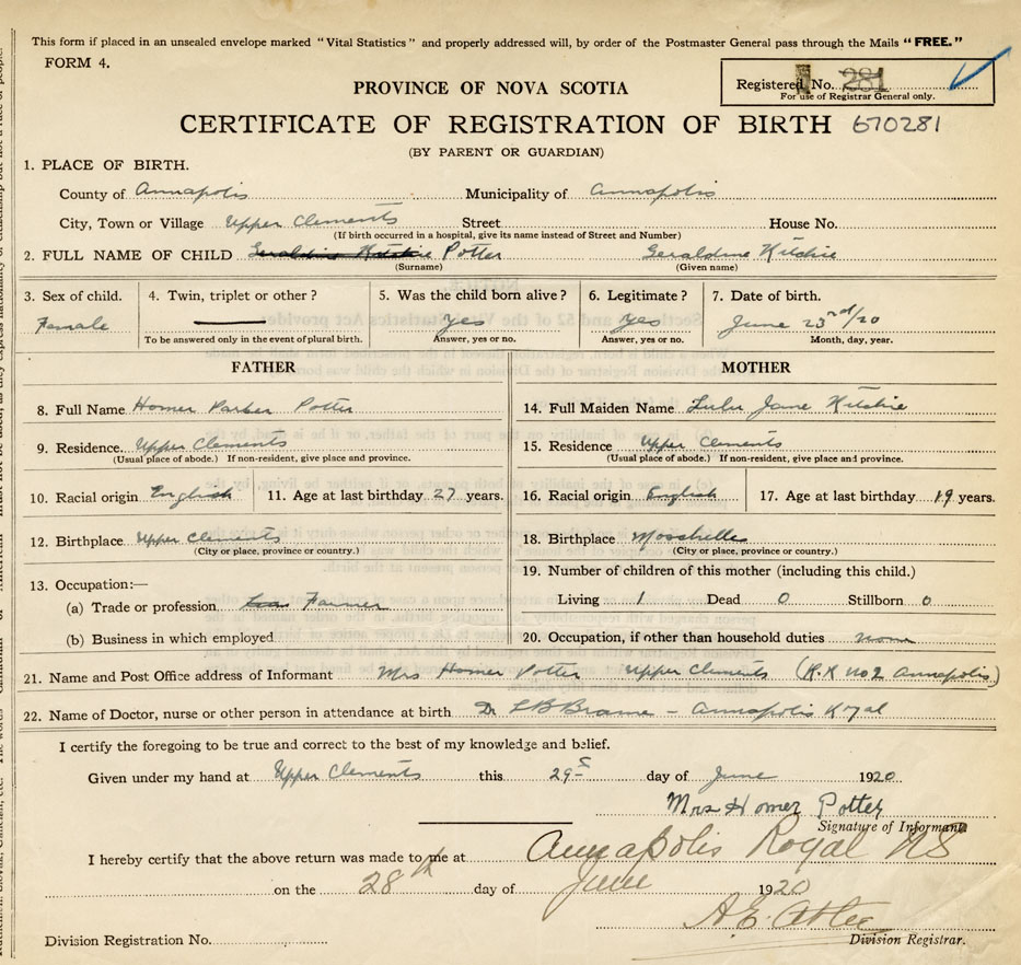 21. Name and Post Office address of Informant Mrs. Homer Potter Upper Clements (R.R. No. 2, Annapolis)