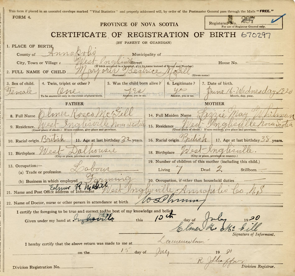 21. Name and Post Office address of Informant Elmer R. McGill West Inglisville, Annapolis Co.