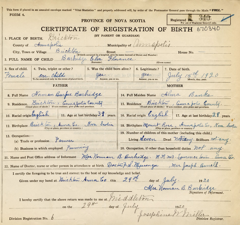 21. Name and Post Office address of Informant Mrs. Norman B. Burnbridge R.R. no. 3, Lawrencetown