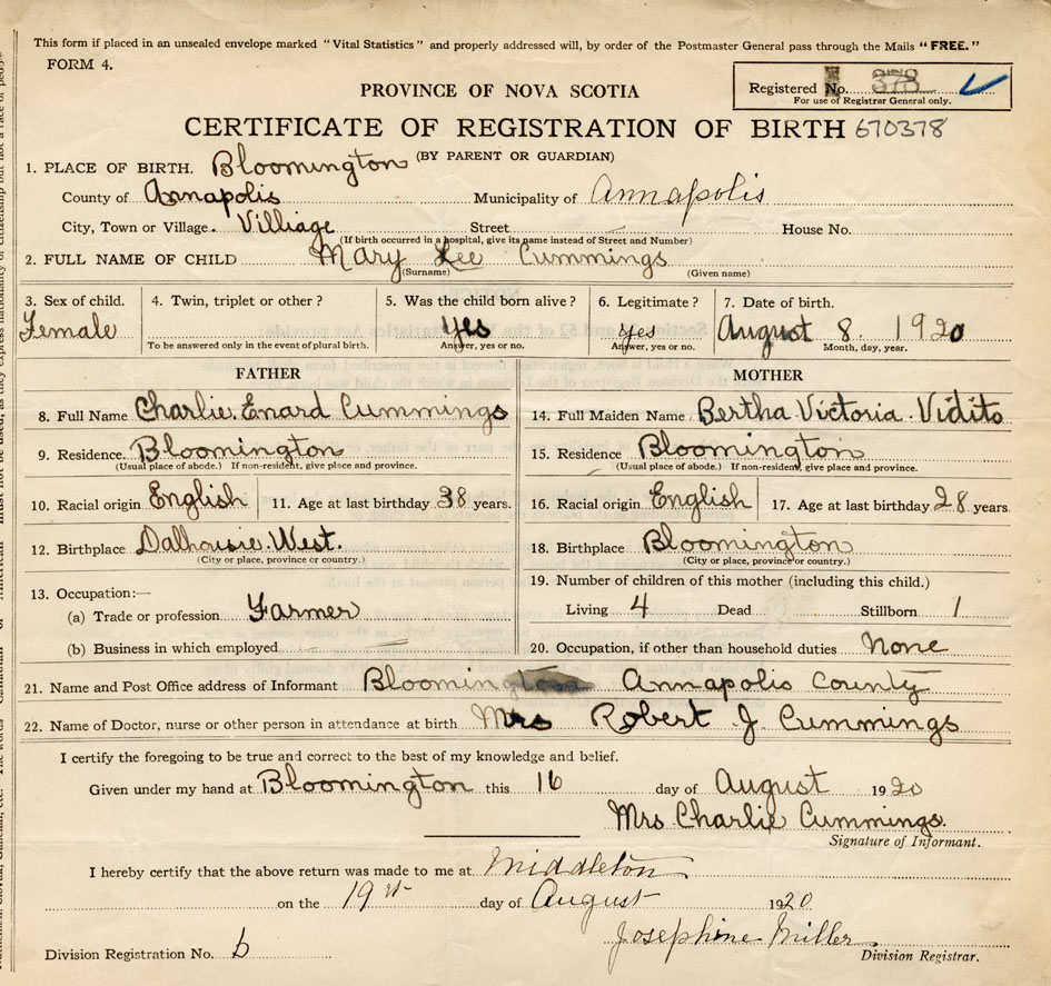 21. Name and Post Office address of Informant Mrs. Charlie Cummings Bloomington, Annapolis County
