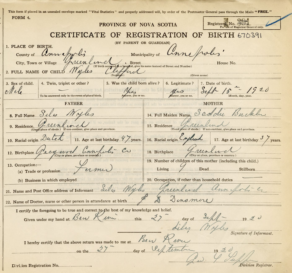 21. Name and Post Office address of Informant Silas Wyles Greenland, Annapolis Co.