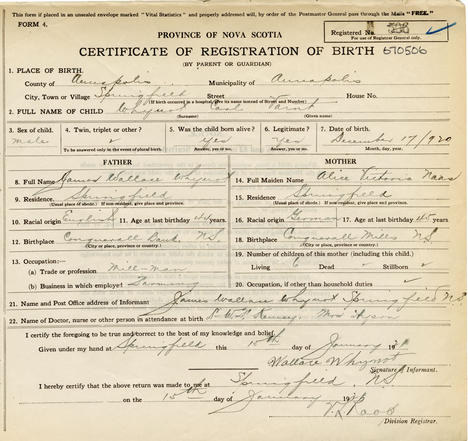 21. Name and Post Office address of Informant James Wallace Whynot Springfield NS