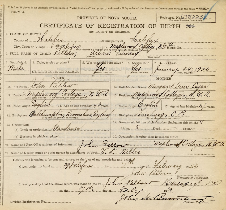 21. Name and Post Office address of Informant John Pellow Maplewood Cottage, North West Arm