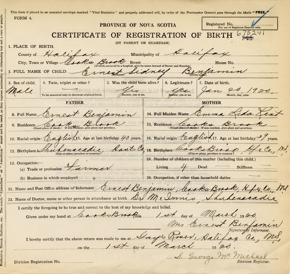 21. Name and Post Office address of Informant Ernest Benjamin Cooks Brook, Halifax Co.