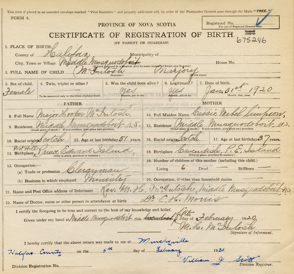 21. Name and Post Office address of Informant Rev. M. H. McIntosh Middle Musquodoboit