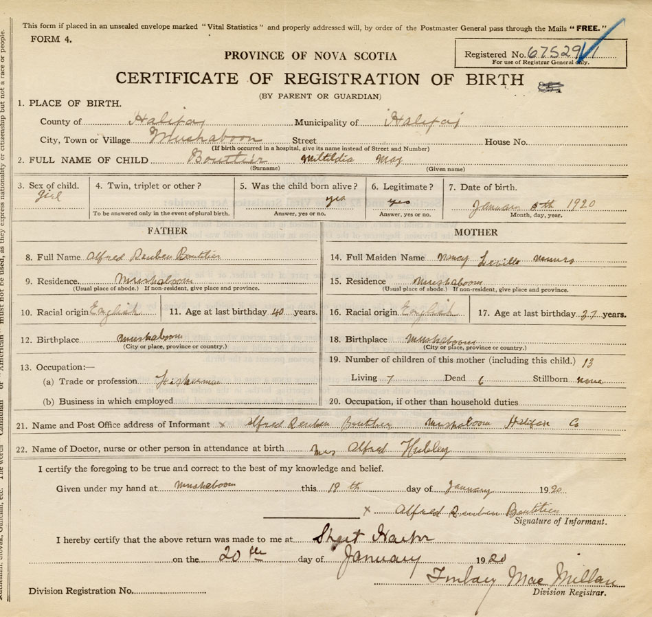 21. Name and Post Office address of Informant Alfred Reuben Boutilier Mushaboom