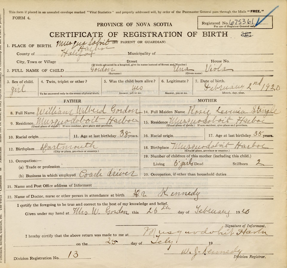 21. Name and Post Office address of Informant Mrs. W. Gordon Musquodoboit Harbour