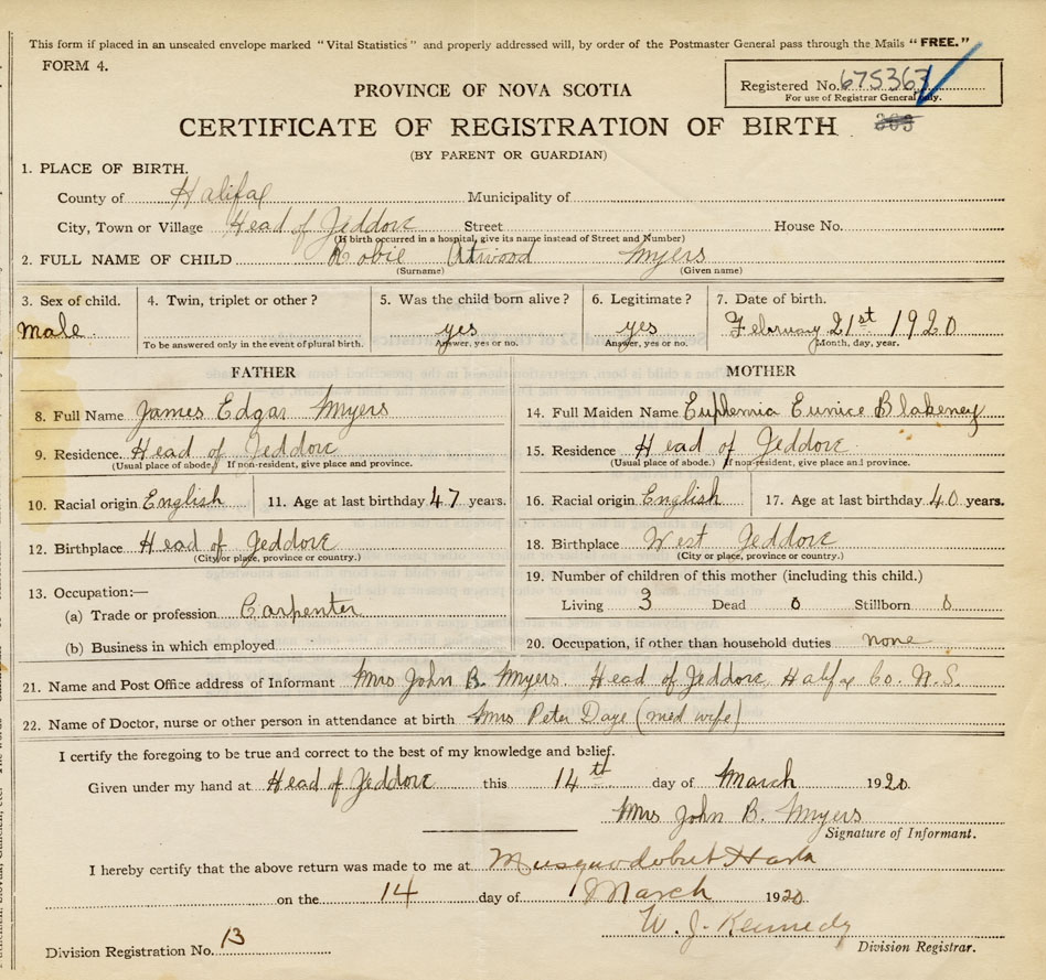 21. Name and Post Office address of Informant Mrs. John B. Myers Head of Jeddore, Halifax Co.