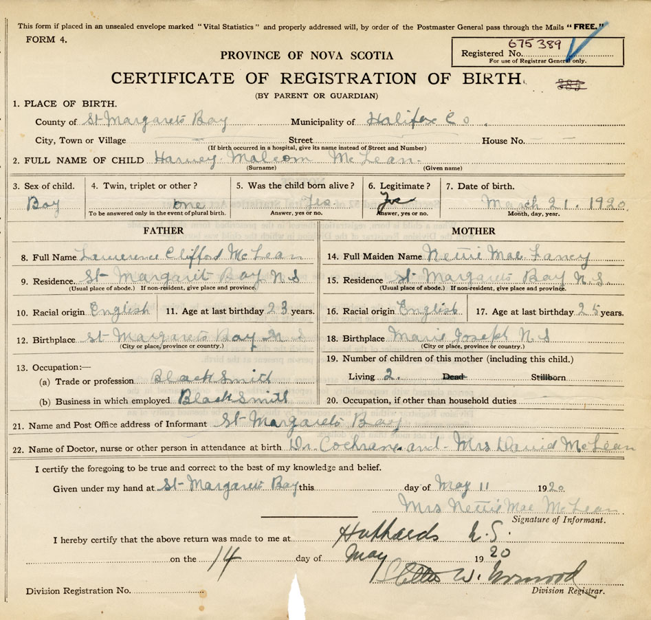 21. Name and Post Office address of Informant Mrs Nettie Mae McLean St Margarets Bay N.S