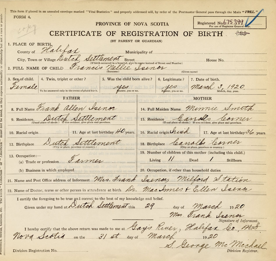 22. Name of Doctor, nurse or other person in attendance at birth Dr. MacInnes and Ellen Isenor
