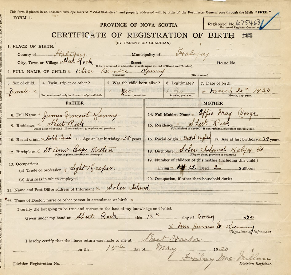 21. Name and Post Office address of Informant Mrs. James V. Kenny Sober Island