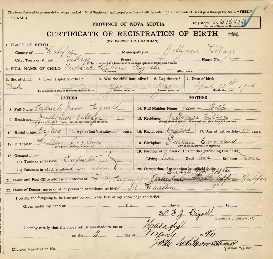 21. Name and Post Office address of Informant F.J. Bignell Armdale Post Office, Halifax