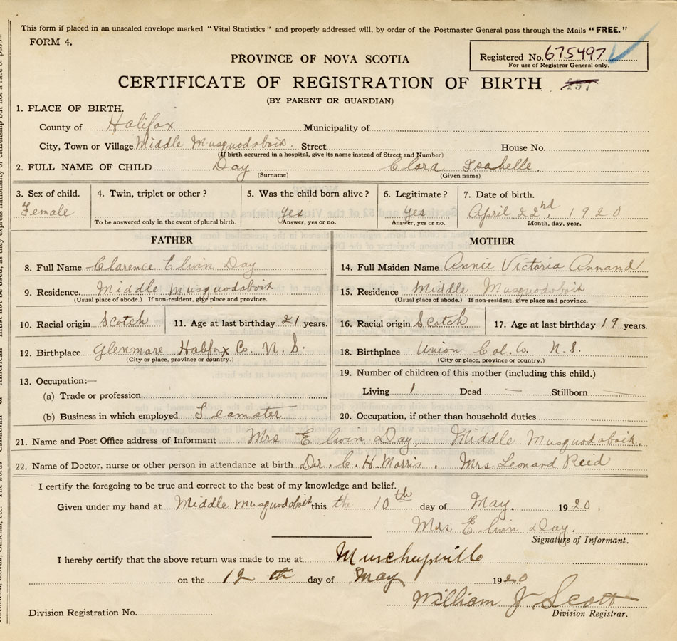 21. Name and Post Office address of Informant Mrs. Elwin Day Middle Musquodoboit