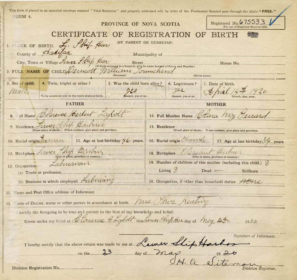 21. Name and Post Office address of Informant Clarence H Laybolt Lower Ship Harbour