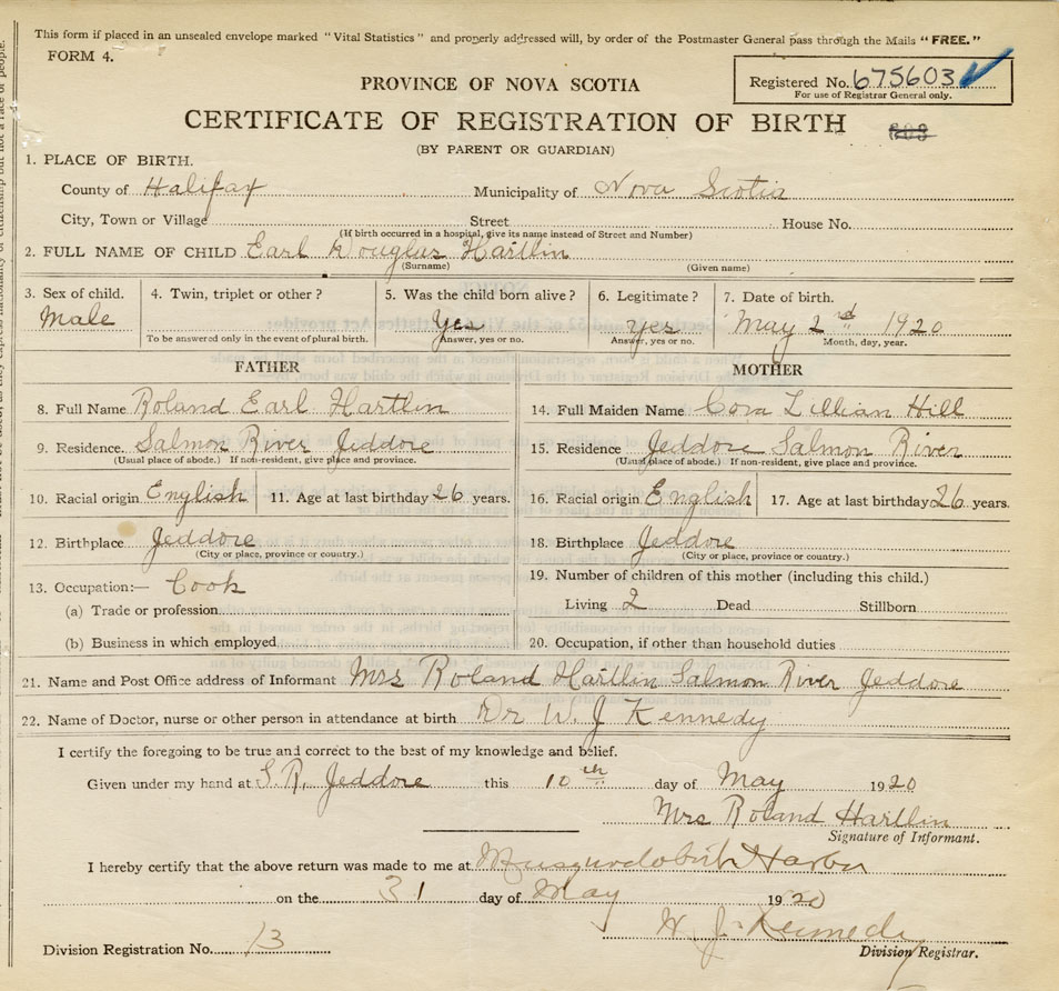 21. Name and Post Office address of Informant Mrs. Roland Hartlen Salmon River, Jeddore