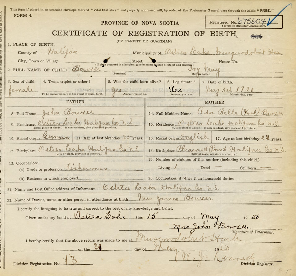 21. Name and Post Office address of Informant Mrs. John Bower Ostrea Lake, Halifax Co.