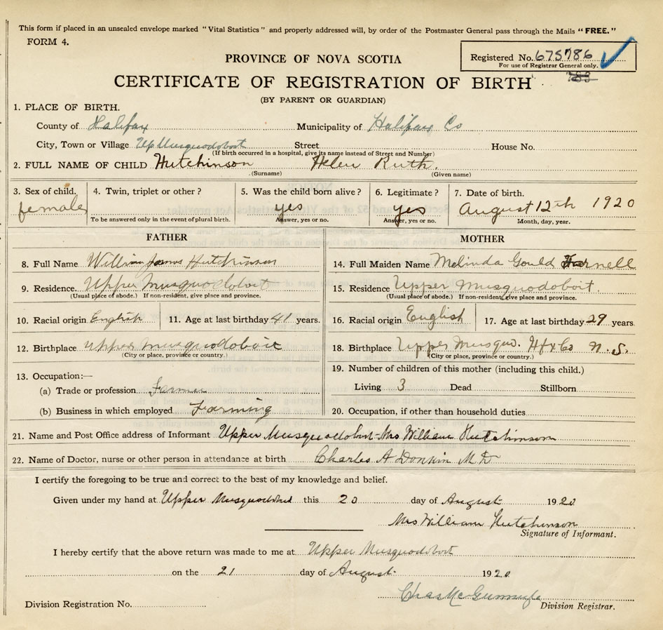 21. Name and Post Office address of Informant Mrs. William Hutchinson Upper Musquodoboit