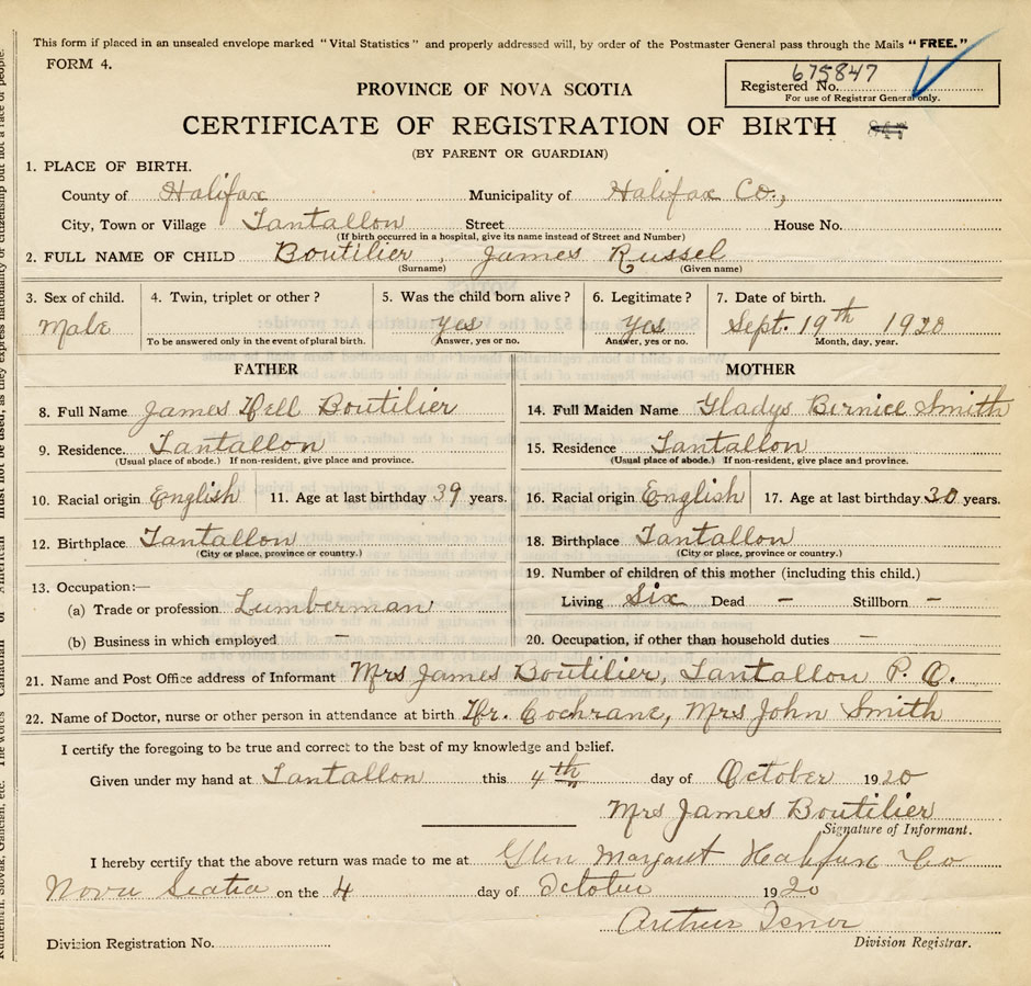 21. Name and Post Office address of Informant Mrs. James Boutilier Tantallon