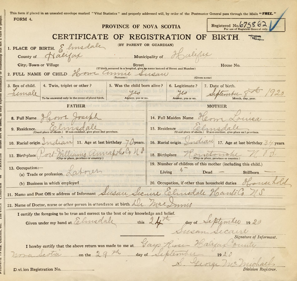 Note: Mi'kmaq - father birthplace Port Williams, Annapolis County, now Port Lorne