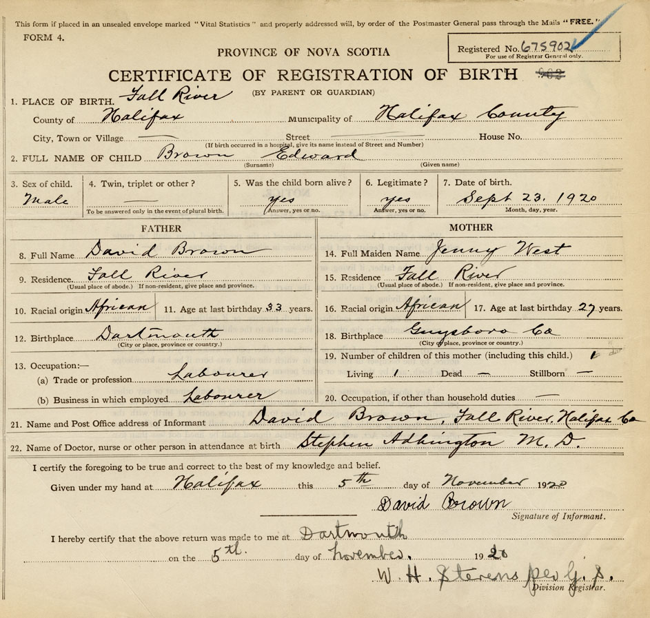 21. Name and Post Office address of Informant David Brown Fall River, Halifax County