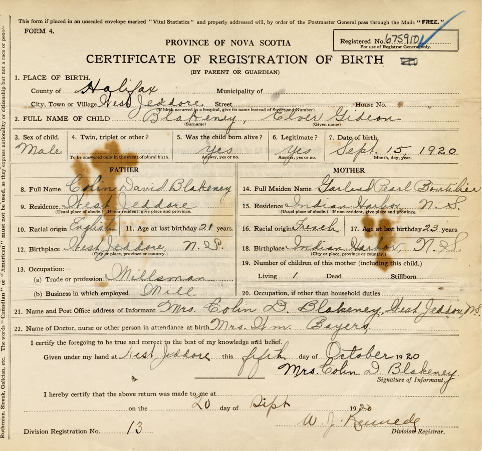 21. Name and Post Office address of Informant Mrs Colin D Blakeney West Jeddore NS