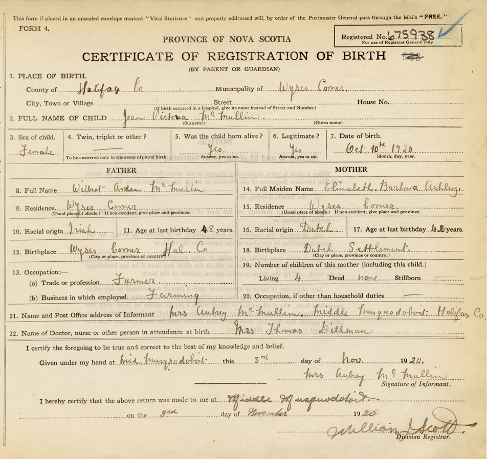 21. Name and Post Office address of Informant Mrs. Aubrey McMullin Middle Musquodoboit